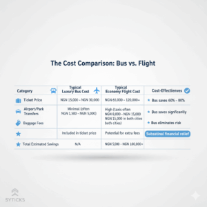 Affordable & Verified Bus Bookings: Syticks aggregates listings from Nigeria’s most reputable luxury bus operators. You can quickly compare prices and departure times for different carriers, ensuring you select the best value-for-money option. This transparency is crucial for managing a tight budget.